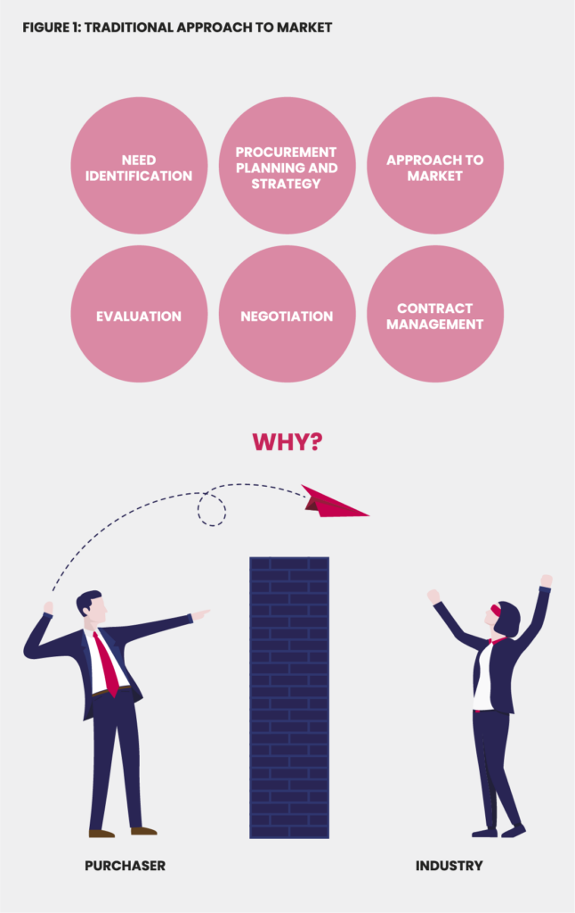 It is especially true for ICT projects that in a traditional approach to market (ATM) the purchaser often expends significant time and money attempting to develop a detailed Statement of Requirements (SOR), including functional and technical requirements, when they may not have the sector-specific expertise to really know ‘what’ they want and ‘how’ to get the required ICT goods and services procured and delivered most effectively. The purchaser develops a detailed ATM documentation suite and then ‘throws it over the fence’ to industry which is ‘blind’ to the reasoning and key drivers behind the SOR and the outcome the purchaser is seeking—leading to, at least, misinterpretation of requirements and respondents building risk premiums into their bid prices. This common situation is illustrated in Figure 1.