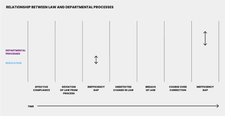 Additionally, as the law changes, if departments do not have their finger on the pulse, undetected regulatory changes may lead to inadvertent breaches of the law. This can lead to a knee-jerk overcorrection in processes to avoid subsequent breaches, which further increases their burden on operations.