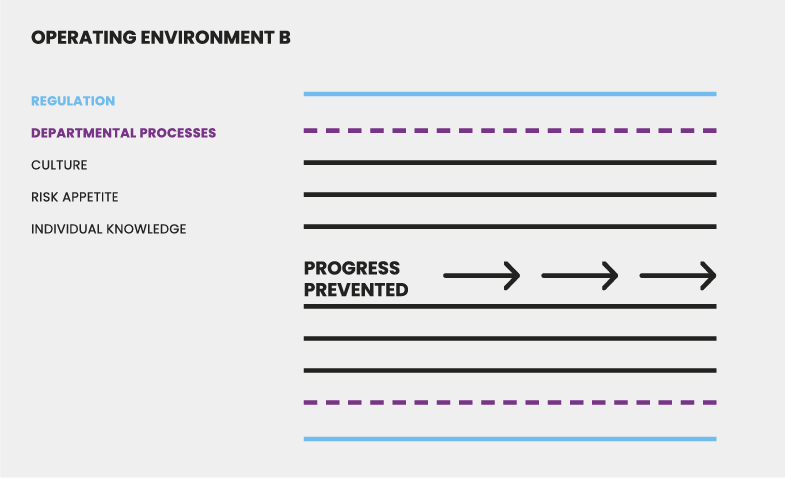 An example of this at play is the interaction between departmental processes and the underpinning regulation.
